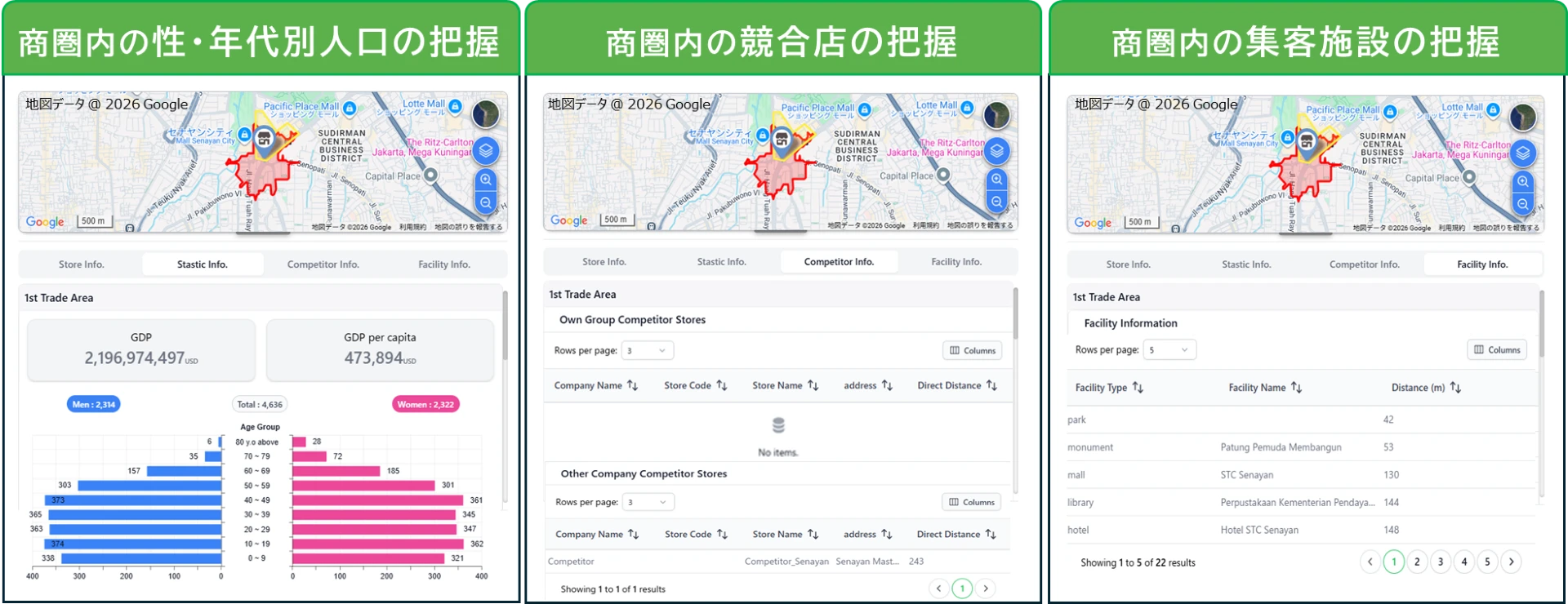 1契約でタイ、マレーシア、インドネシア、フィリピン、シンガポール、ベトナム、カンボジア、ラオス(ASEAN主要国)と台湾の9つの国と地域における商圏分析と出店進捗管理が可能です。