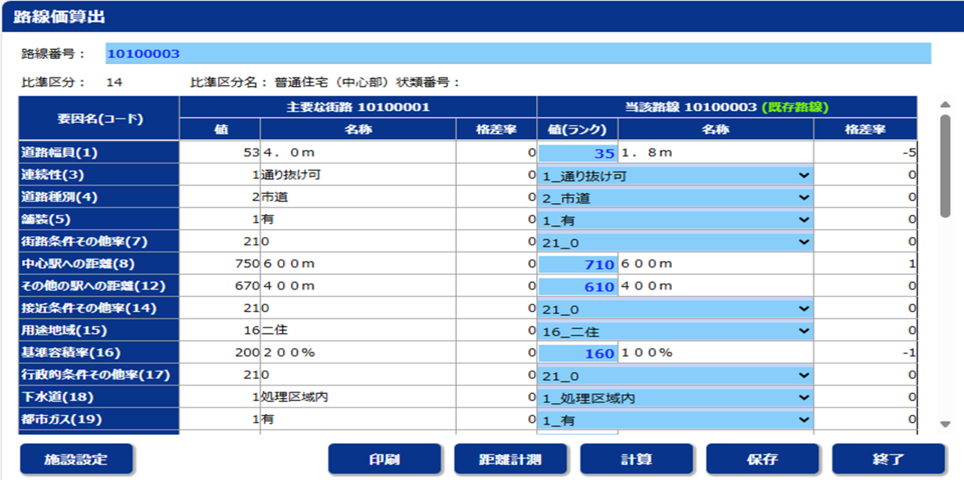 新設路線に対して価格形成要因を設定するだけで、比準表を用いて路線価を自動算出できます。