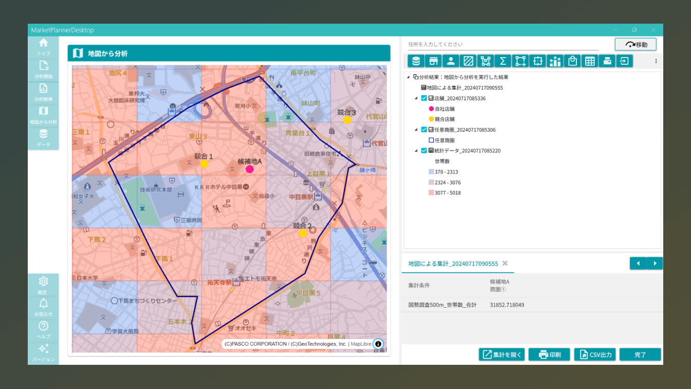 国勢調査や商業統計の各種統計情報や自社店舗、競合店舗、既存顧客などの情報を地図上に取り込み可視化し、 店舗出店に関わる迅速な意思決定をサポートします。