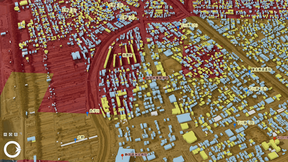 河川堤防が決壊した後、時間経過とともに建築物や道路などが浸水していく様子をアニメーションでわかりやすく可視化します。