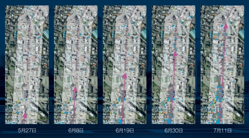 シールド⼯法等による地下⼯事の進捗に合わせて、道路周辺で⽣じる微細な地表変位が安全な範囲に収まっていることを継続的に確認します。住宅地等の現地測量を実施しにくい箇所を含む広域を面的に解析します。